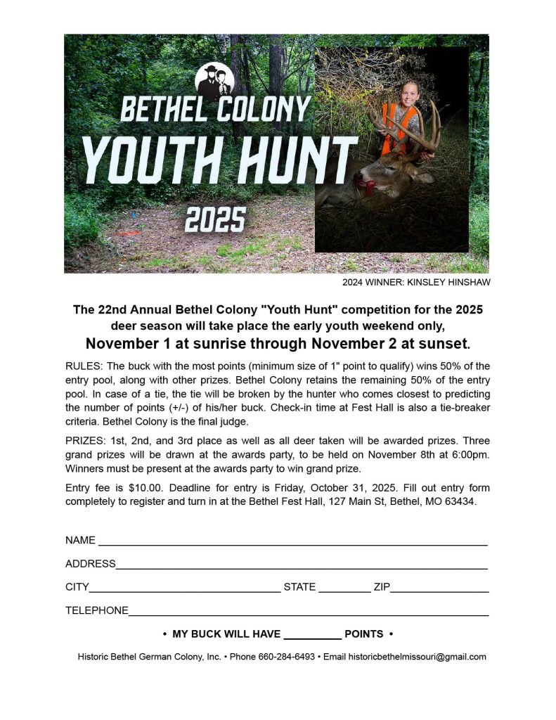 The northeast Missouri region is known for its great hunting, and the Bethel Colony has been offering an annual Big Buck hunt for youth for 21 years. This year, the Bethel Colony “Youth Hunt” competition for the 2025 deer season will take place during early youth weekend, November 1st at sunrise through November 2nd at sunset.